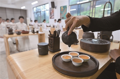 5月8日,福建武夷山旅游职业中专茶艺与茶营销专业的学生在老师的示范下学习茶艺。近年来,武夷山市持续推进茶文化、茶技能教育走进校园,在当地职业学校重点开设了茶艺、茶叶加工、茶营销等专业,为茶文化传播培养职业技能人才。