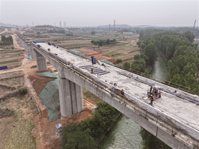 5月8日,中铁十二局工人在雄忻高铁河北段站前3标段建设现场(无人机照片)。初夏时节,雄忻高铁河北段建设抢工期、赶进度,高标准、高质量推进项目建设。雄忻高铁建成通车后将服务于京津冀城市群和晋中城市群快速旅客交流。