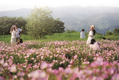 月见花海 近日,良渚古城遗址公园的雉山脚下,大片的月见草迎来盛花期。粉白的花盏随风摇曳,层层叠叠,织出一片梦幻的月见草花海,吸引不少游客纷至沓来。图为昨天,良渚古城遗址公园雉山站旁,人们在月见草花海内拍照。 商报记者 项凯 摄影报道