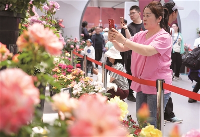 5月11日,游客在第九届国际月季大会现场拍摄月季花。第九届国际月季大会于5月10日至15日在北京市门头沟区举办。本届大会集中展示来自世界各地的千余种月季,涵盖国际学术会议、第十二届中国月季展,吸引大量游客前来赏花游玩。