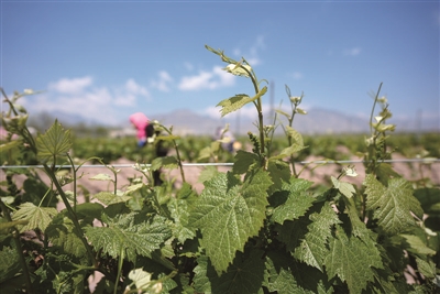 5月9日,工人在宁夏银川市贺兰山东麓的海悦仁和酒庄为葡萄藤抹芽、剪枝。近日,贺兰山东麓的酿酒葡萄进入结果关键期,当地酒庄组织工人对葡萄藤进行抹芽、剪枝等管护工作,以保证葡萄长势。贺兰山东麓位于北纬37度至39度,是我国最大的酿酒葡萄集中连片种植区和酒庄酒产区。
