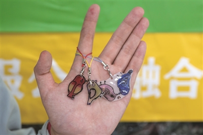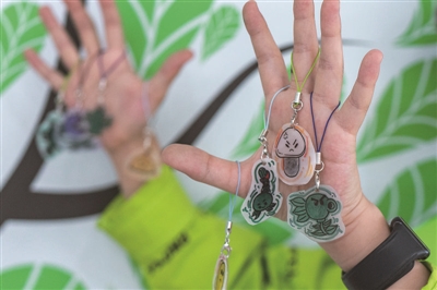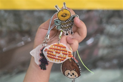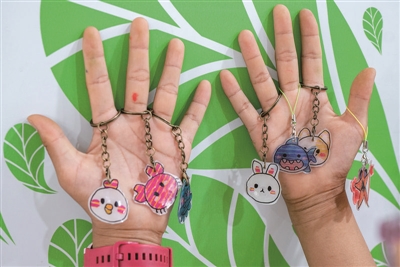 小记者史瑾怡、史瑾瑜两兄妹,属相是狗,于是做了狗狗钥匙扣。“植物大战僵尸”是小记者宋浩然最喜欢的游戏,“太阳花”“豌豆射手”“西瓜投手”“食人花”“土豆地雷”“仙人掌”……游戏中的角色被他一样样做成挂饰。