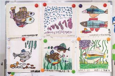 课堂上,老师通过图片带领学生们走进杭州溪流的水下世界,一条条小鱼的美丽,引得同学们发出阵阵惊叹。老师细致地示范了鱼鳍、鱼鳞的线条与造型画法,要求“同学们把这条小鱼的细节画丰富”。