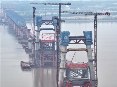 5月15日,崇启(江苏启东与上海崇明)公铁长江大桥南、北主塔进入施工冲刺阶段。据悉,大桥总体施工进度已完成三分之二。这座大桥是沪渝蓉高速铁路全线重点控制性工程,大桥全长4.09公里。这是大桥南、北主塔施工现场(无人机照片)。