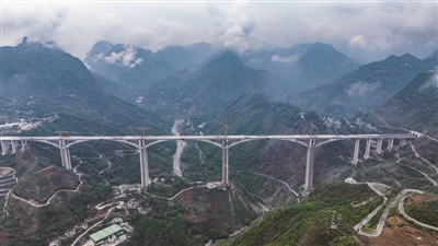 5月15日,位于贵州省六盘水市六枝特区境内纳晴高速六枝特大桥顺利合龙,为推动纳(雍)晴(隆)高速全线通车的目标奠定了坚实基础。六枝特大桥全长2023.5米,桥面距谷底水面净空315米。这是顺利合龙的纳晴高速六枝特大桥(无人机照片)。
