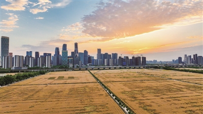 最近,位于杭州亚运村东侧的“麦田CBD”迎来了金黄时刻。远处的高楼、飞驰的高铁和镀着金边的麦浪同框,勾画出一幅绝美画卷,美不胜收,吸引不少市民专程赶来打卡。 商报记者 项凯 摄影报道