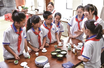 5月14日,学生在贵州省铜仁市江口县贵茶产业园茶室参加研学,了解抹茶茶饮制作。地处武陵山脉腹地的江口县被誉为“世界抹茶超级工厂”。这里拥有抹茶高标准原料基地和生产线,以及全球最大的抹茶单体精制车间。2024年,江口县抹茶产量达1300吨,产值3.02亿元。