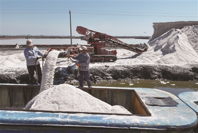 5月18日,河北省唐山市曹妃甸区南堡盐场的工人将收获的春盐装船(无人机照片)。近日,南堡盐场的35万亩盐田迎来春盐收获期,工人利用晴好天气加紧收获,盐田里处处繁忙景象。