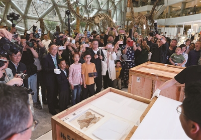 5月18日,在上海自然博物馆举行的“龙吟九州·中国恐龙大展”展品开箱仪式上,参观者观看、拍摄恐龙化石。 当天是国际博物馆日。人们走进博物馆,叩启时空之门,“触摸”文化的年轮。新华社发