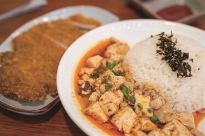 麻辣豆腐配炸猪排,这道菜左边是白瓷碗里堆着的嫩豆腐,盖着红亮的麻辣酱汁;右边是漆盘上的炸猪排,金黄的面衣下透出粉嫩的肉色,旁边一小碟上海黄牌辣酱油和番茄沙司。