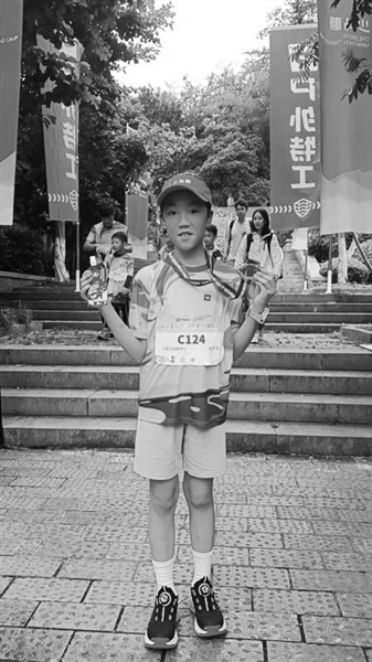 ▲完赛后,少马营3.5公里组选手手持高原苹果汁与奖牌合影留念。