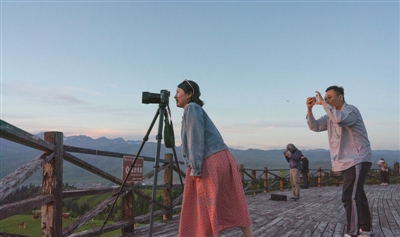 5月22日,在新疆那拉提景区一处观景平台,摄影爱好者拍照留念。位于天山环抱伊犁河谷之中的那拉提草原绿意盎然,迎来一年中的“最美时刻”。