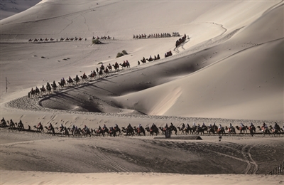 5月24日,游客骑骆驼在甘肃省敦煌市鸣沙山月牙泉景区游览。