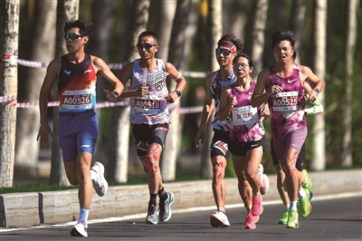 5月25日,2025长春马拉松在吉林省长春市鸣枪开跑。本次比赛设马拉松、半程马拉松、健康跑三个项目,约35000名选手参赛。这是中国选手黄雪梅(右二)在比赛中,她以2小时33分48秒的成绩获得马拉松女子组冠军。