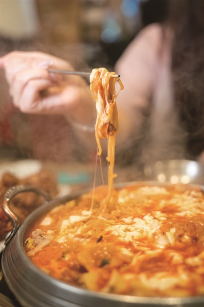 我点了一份肥牛年糕锅,端上桌后,帅气的店员会热情地与顾客击掌互动,一句“Give me five!”瞬间拉近了彼此的距离,让用餐变得有趣。肥牛卷铺满表层,年糕软糯Q弹,鱼饼、泡菜、午餐肉、辛拉面层层堆叠,店员贴心地帮忙搅拌、调整火候。等汤底沸腾后,再倒上一层厚厚的芝士。吸满汤汁的辛拉面Q弹劲道,关键是还能无限续加,吸满汤汁的拉面,甚至比部队锅本身还好吃。年糕裹着浓稠的芝士入口,甜辣交织,奶香四溢,