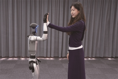 4月23日,在知名机器人公司杭州宇树科技展厅内,宇树人形机器人G1展示本月更新的拥抱、飞吻、“光波”等动作。 新华社发