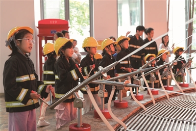 6月2日,小朋友在杭州青少年活动中心“Do都城”体验“消防员”灭火救援。端午小长假,市民带着孩子们来到浙江杭州青少年活动中心“Do都城”,参加端午主题活动,模拟各类职业体验,度假日。 新华社 发