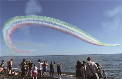 6月1日,人们在意大利罗马附近的拉迪斯波利观看飞行表演。当日,意大利“三色箭”飞行表演队在意大利罗马附近的拉迪斯波利举行的航展上表演。