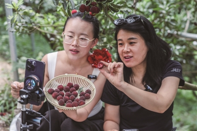 6月4日,在慈溪市匡堰镇杨梅果园大棚内,主播在杨梅树下直播销售杨梅。近期,浙江省慈溪市首批大棚杨梅陆续上市,杨梅之乡开启了夏日丰收季。2024年慈溪杨梅产量6.6万吨、产值超10亿元。