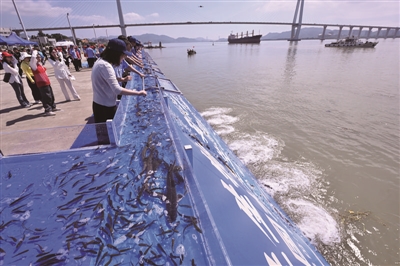 6月6日,由农业农村部和福建省政府共同主办的全国水生生物同步增殖放流主会场活动在福州市闽江入海口举行,现场投放了中华鲟、日本鳗鲡、花鲈、鲢、鳙、鳜等各类海淡水苗种285万尾。这是嘉宾在闽江入海口的主会场活动中投放鱼苗。