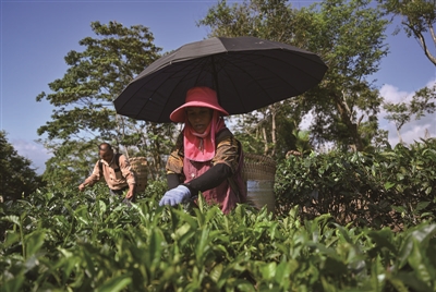 6月8日,工人在位于海南五指山市与保亭黎族苗族自治县交界处的海南农垦金鼎茶园采茶。海南大叶茶是海南省中部山区特有的茶种,在2024年被证实和发现是一种新的山茶属物种。目前,五指山、保亭、白沙等市县不断扩大种植规模,将茶产业作为巩固脱贫攻坚和推进乡村振兴的重要抓手,把绿叶变成百姓致富“黄金叶”。