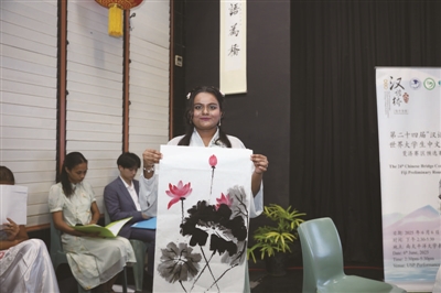 上图为6月6日,在老挝首都万象,“汉语桥”世界大学生中文比赛老挝赛区决赛的参赛选手展示才艺。右图为6月6日,在斐济首都苏瓦,“汉语桥”世界大学生中文比赛斐济赛区比赛的参赛选手展示中国画作品。