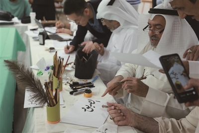 6月9日,在科威特哈瓦利省,人们在科威特中国文化中心参加活动。为庆祝首个联合国“文明对话国际日”,一场名为“对话·知音暨兰亭·雅集”的中科书法和音乐文化交流活动9日晚在科威特中国文化中心举行,中科各界近200名嘉宾参加了活动。