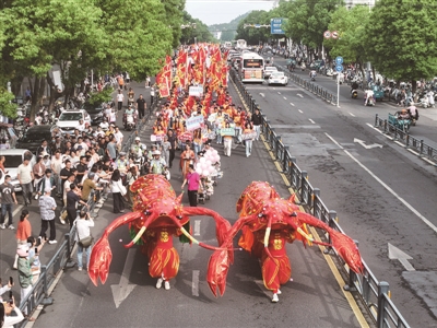 6月12日,第25届盱眙龙虾节群众文化巡游活动在江苏盱眙街头举行。3.2公里的巡游线路上,欢声笑语与铿锵锣鼓交织,巨型“龙虾”、汉服等元素以及精彩的表演吸引众多市民和游客驻足观看。地处淮河下游、洪泽湖南岸的盱眙是我国著名的龙虾之乡。经过数十年的发展,全县小龙虾养殖面积达98.5万亩。这是12米长的“龙虾”在巡游队伍中(无人机照片)。