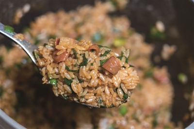 第七版的海肠捞饭,每一份米饭都用铁锅现焖,焖好后再拌入现炒的海肠,勺子每翻动一下,鲜味就从铁锅里溢出一些,香啊。
