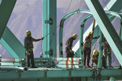 6月11日,建设者在贵州花江峡谷大桥上安装观景长廊。目前,工程建设者正在为在建的世界第一高桥——花江峡谷大桥安装观景长廊、玻璃栈桥式餐厅、极限运动设施等桥旅融合项目设备。花江峡谷大桥是贵州六安高速公路的控制性工程,全长2890米、桥面距水面高625米,预计今年下半年建成。