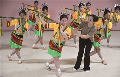 6月10日,海南省民族技工学校老师刘青梅(右三)指导学生练习黎族舞蹈《守山兰的阿妹》。近年来,五指山市打造“非遗进校园”工程,在14所公办中小学开设非遗课程,培养青少年对传统文化的热爱,助力非遗传承与发展。