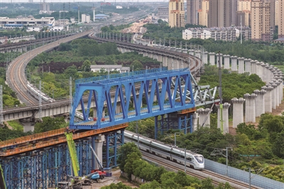 跨越 6月15日凌晨,新建上海至南京至合肥高铁重达近千吨的钢桁梁成功跨越沪蓉铁路,为后续架梁施工奠定基础。这是新建沪宁合高铁钢桁梁跨越沪蓉铁路(无人机照片)。