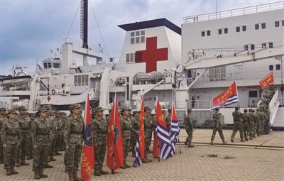 海军“丝路方舟”号医院船起航 6月16日,中国海军“丝路方舟”号医院船从海南三亚某军港解缆起航,赴南海各岛礁执行“健康送海疆”任务。这是医务人员在码头集结登船。