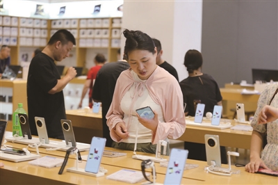 6月15日,顾客在四川省乐山市一大型商场内挑选新款手机
