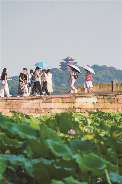 市气象局消息,17日开始到21日,杭州大部分地区最高气温将突破35℃,开启高温天模式。杭州还没有出梅,现在的阶段叫“梅中有伏”,当副热带高压提前加强北抬,处于副高的控制之下,梅雨期里就会出现一段晴热天气。请大家出门时带好伞,做好防暑降温工作。图为昨天,游客撑伞走在绿意盎然的断桥上。