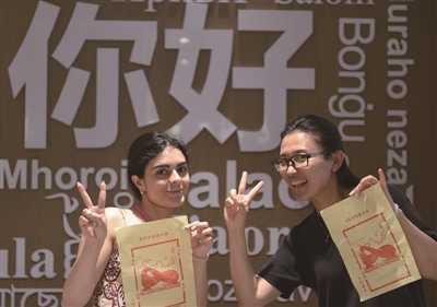 6月17日,北京外国语大学的意大利毕业生马芙蓝(左)与她的老师田卫卫一起展示她们制作的木版水印作品。当日,北京外国语大学“华韵别礼”2025届毕业季系列首场活动举行,国家级非物质文化遗产项目木版水印技艺代表性传承人、浙江十竹斋版画博物馆馆长魏立中指导师生现场体验拓印母校主题版画,为毕业生留存独特纪念。