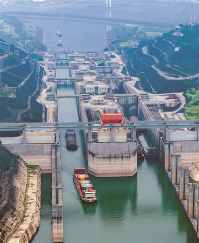 6月18日,在湖北宜昌,船舶有序通过三峡双线五级船闸。