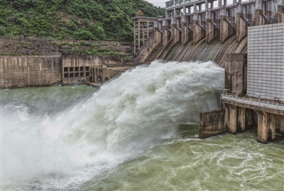 6月19日,湖南省永州市境内的双牌水库开闸泄流(无人机照片)。前一天,为应对新一轮强降雨,国家防汛抗旱总指挥部对安徽、湖北、湖南、重庆、贵州启动防汛四级应急响应,并派出3个工作组分赴重点地区协助指导防汛救灾工作。