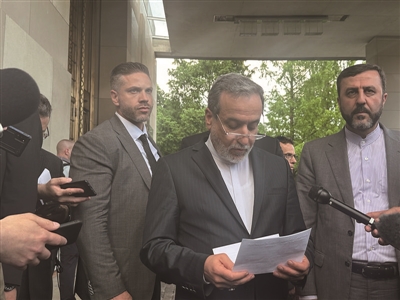 6月20日,在瑞士日内瓦,伊朗外交部长阿拉格齐(中)与媒体见面(手机照片)。伊朗与英法德三国外交部长当地时间20日19时左右结束在瑞士日内瓦持续约3个小时的会晤。这是以色列与伊朗发生军事冲突以来,伊朗首次与西方国家高级官员进行面对面磋商。
