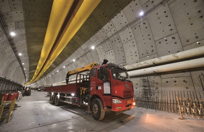 6月22日,山东省济南市黄岗路穿黄隧道顺利完成黄河段掘进任务,这一世界最大直径水下盾构隧道工程建设取得阶段性突破。济南市黄岗路穿黄隧道全长约5755米,其中盾构段长约3290米,盾构机开挖直径17.5米,是目前在建的世界最大直径水下盾构隧道。这是施工车辆在黄岗路穿黄隧道内行驶。