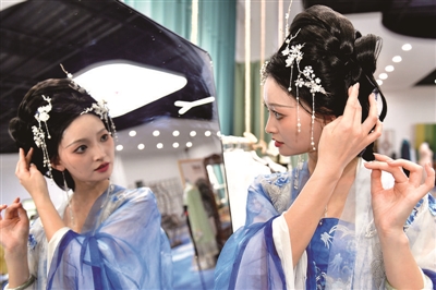 6月17日,在曹县有爱云仓汉服基地,汉服模特吴静如在整理装扮。菏泽市曹县位于山东省西南部、鲁豫两省交界处,是全国汉服生产销售基地之一。目前,全县共有汉服企业2750多家,网店约1.5万个,汉服从业者近10万人,汉服产业年销售额在120亿元左右,成为当地群众增收、乡村振兴的新引擎。 曹县以汉服、电商为依托,形成了涵盖原创研发、设计制作、版权保护、裁剪打版、绣花印花、展演展示以及网络营销等完整的产业链条。如今,曹县汉服产业正在向规模化、品牌化、高端化跃升。以马面裙为主的汉服销往澳大利亚、加拿大、欧盟等10余个国家和地区。