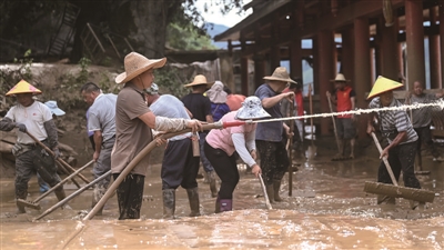 6月26日,在广西柳州市三江侗族自治县良口乡良口村,村民在清理淤泥。受连日强降雨和上游来水影响,三江县沿江一线的乡镇出现内涝、道路溜方等情况。洪水退后,当地立即组织力量开展灾后自救工作,恢复生产生活秩序。