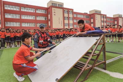 6月26日,在河北省邯郸市邱县第二中学附属小学,蓝天救援队队员指导学生学习救援落水者的方法。暑假临近,邱县二中附小开展安全教育活动,学生在蓝天救援队的指导下学习防溺水常识、演练急救技能,提高安全意识和自救能力。