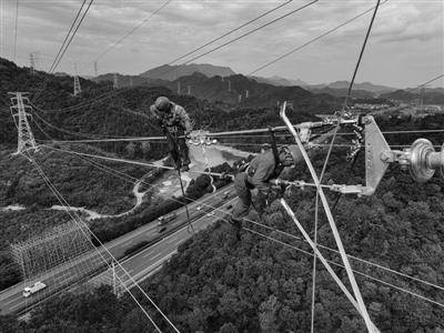 国网杭州供电公司员工开展塔上架线工作 唐衎摄