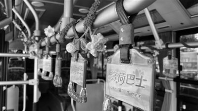 除了线路设计,游客上车后,还能看到无处不在的“荷”元素。车厢内,由司机陈慧荣编制的毛绒荷花作品被布置在车厢的拉环、扶手上,让整个车厢化身为一个流动的“手作荷塘”。而在车身上,则又点缀着独特毛线纹理的荷花与荷叶图案,第一时间点明它的主题。