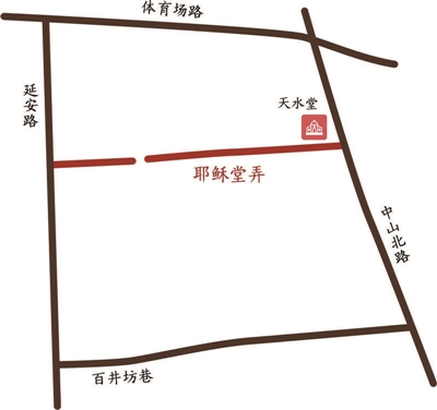 这条总长约300米的小弄堂,东起中山北路,向西穿到延安路,宋代时名叫兴福寺巷,清代改名叫耶稣堂弄。听巷子名就知道,巷里应该有座很有名气的教堂。走到耶稣堂弄口,就能看到这座杭州最早的基督教堂——天水堂,这里曾经是西方传教士来杭州传教的起点。