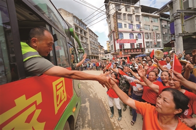 7月3日,各地驰援贵州省榕江县的抗洪抢险救援队伍开始有序撤离,当地群众自发涌上街头,送别救援队伍,表达感激之情。这是当地居民与救援队员握手告别。