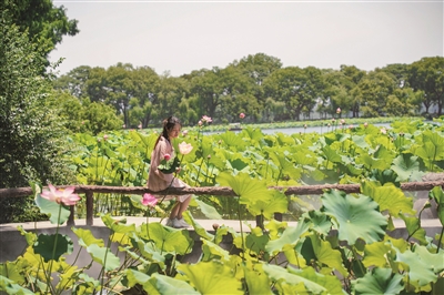 近日,杭州天气开启“烧烤模式”,西湖边的荷花进入盛花期,吸引游客纷至沓来,争相观赏“映日荷花别样红”的西湖美景。市气象台消息,今天晴热依旧是天气主旋律,最高气温持续锁定在38~40℃,大家出门请做好防暑降温工作。图为昨天游客在曲院风荷景区打卡荷花。商报记者 项凯 摄影报道
