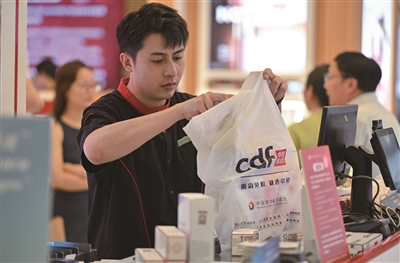 7月5日,海口日月广场免税店的工作人员在打包免税品。