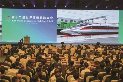 第十二届世界高速铁路大会 在北京举行 7月8日拍摄的第十二届世界高速铁路大会会场。当日,第十二届世界高速铁路大会在北京举行。本届大会以“高速铁路:创新发展让生活更美好”为主题,由中国国家铁路集团有限公司和国际铁路联盟共同主办,国内外铁路技术人员、企业负责人、政府官员和国际组织代表等2000余人参加开幕式。
